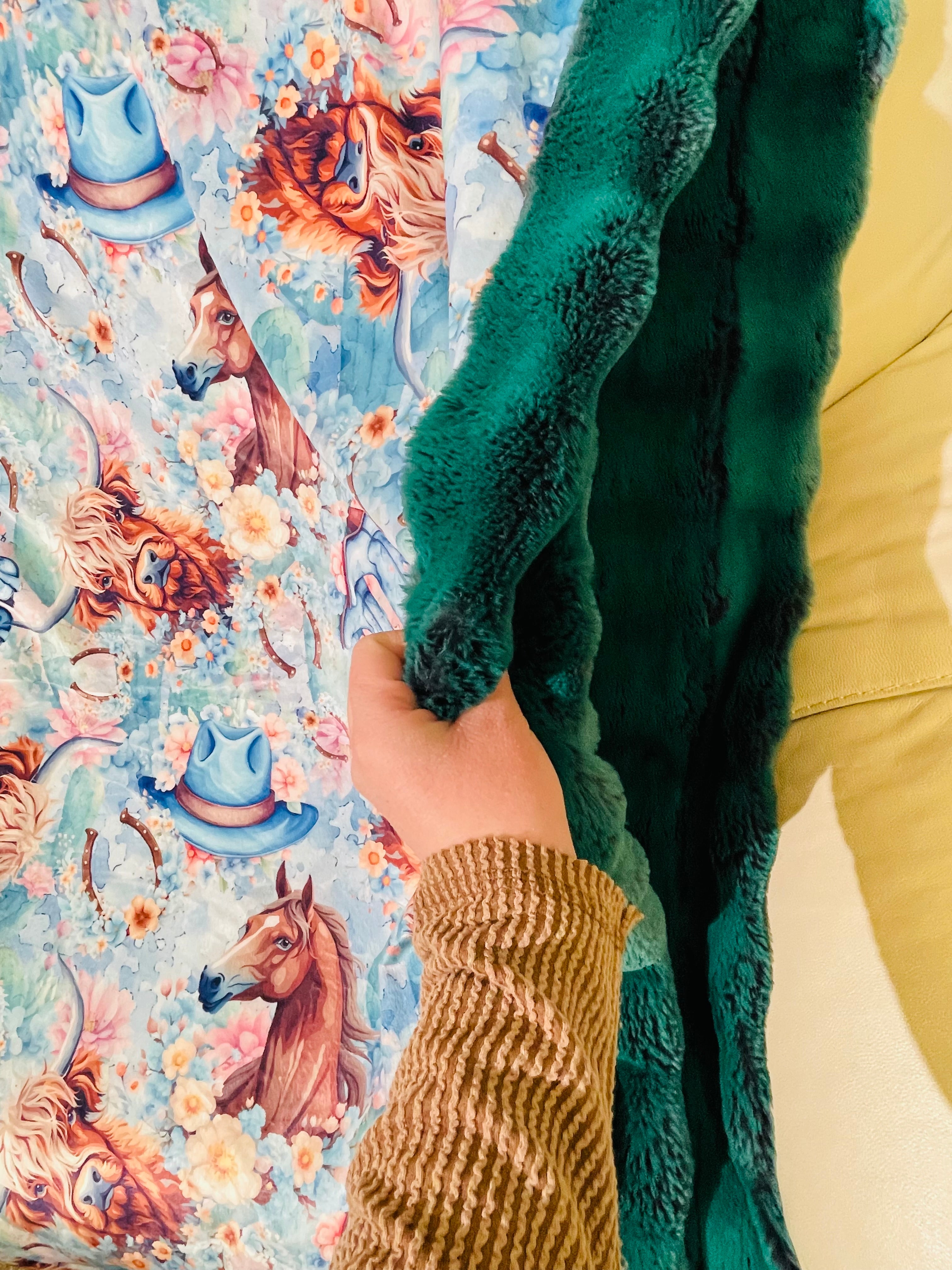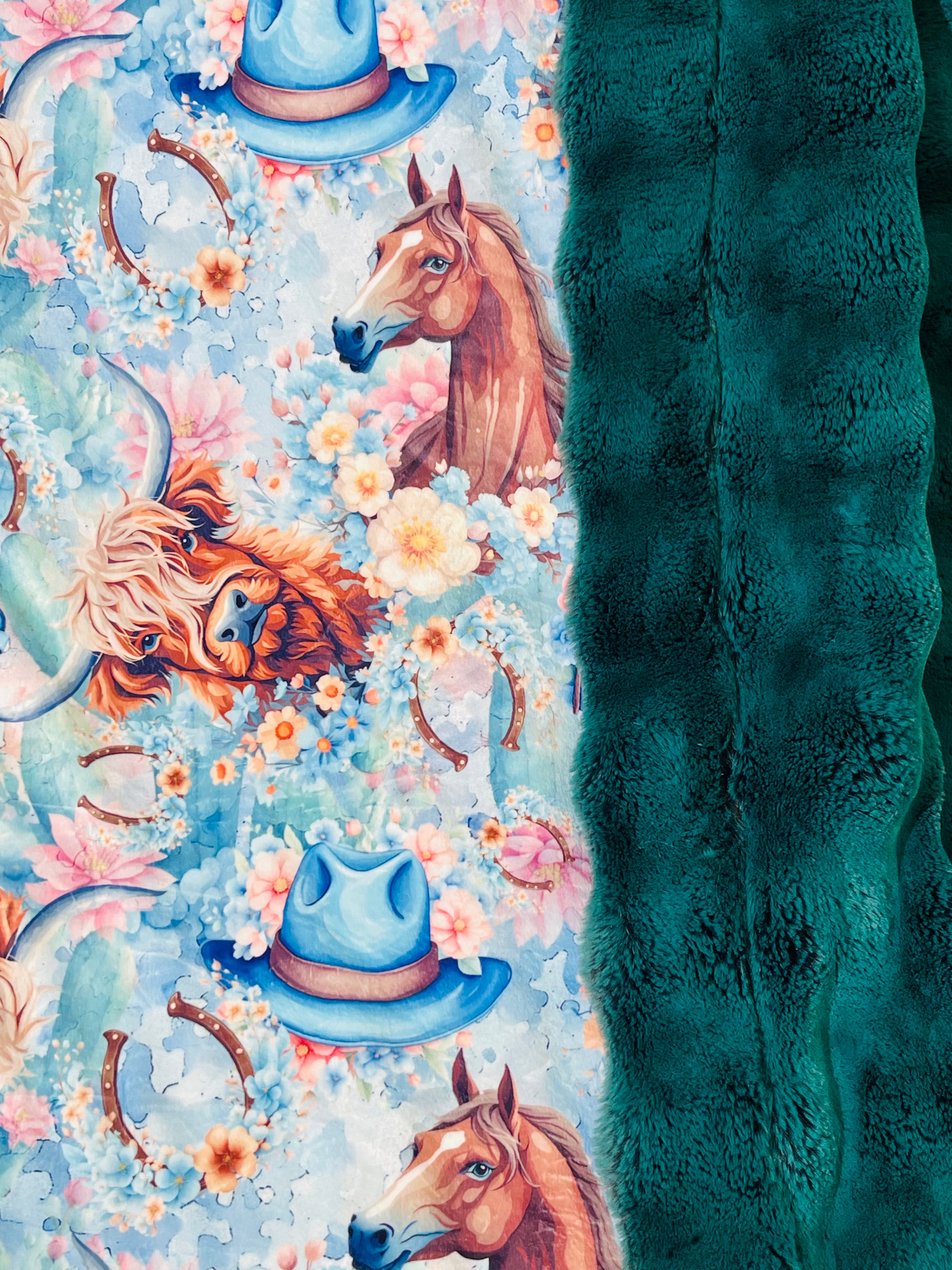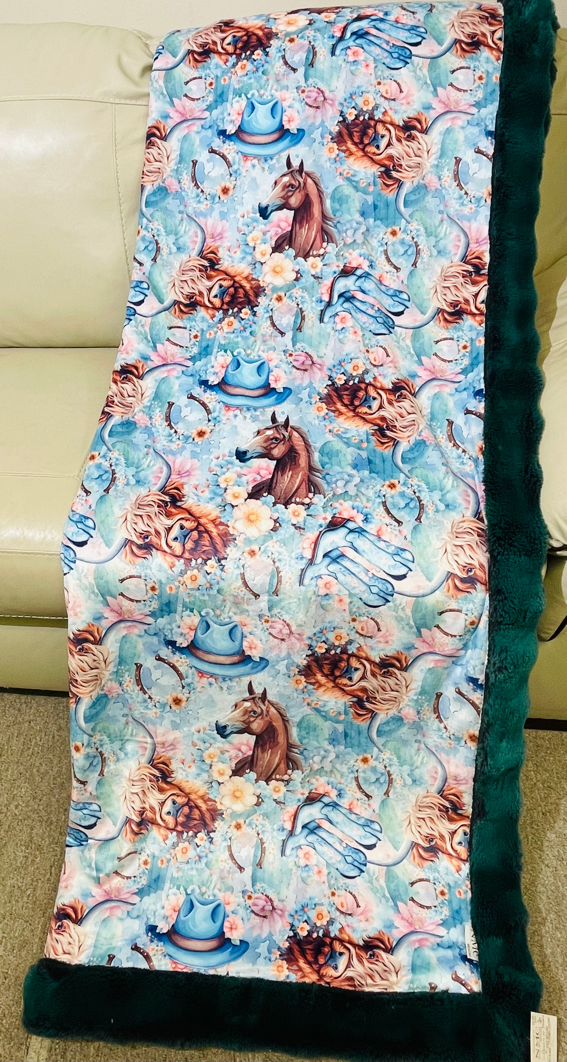 Cows, Horses, & Boots/Everglade Frosted Powderpuff-Mega bordered 55”x87” Appx